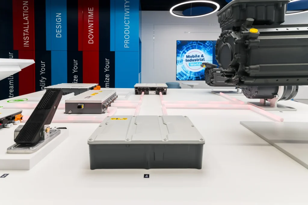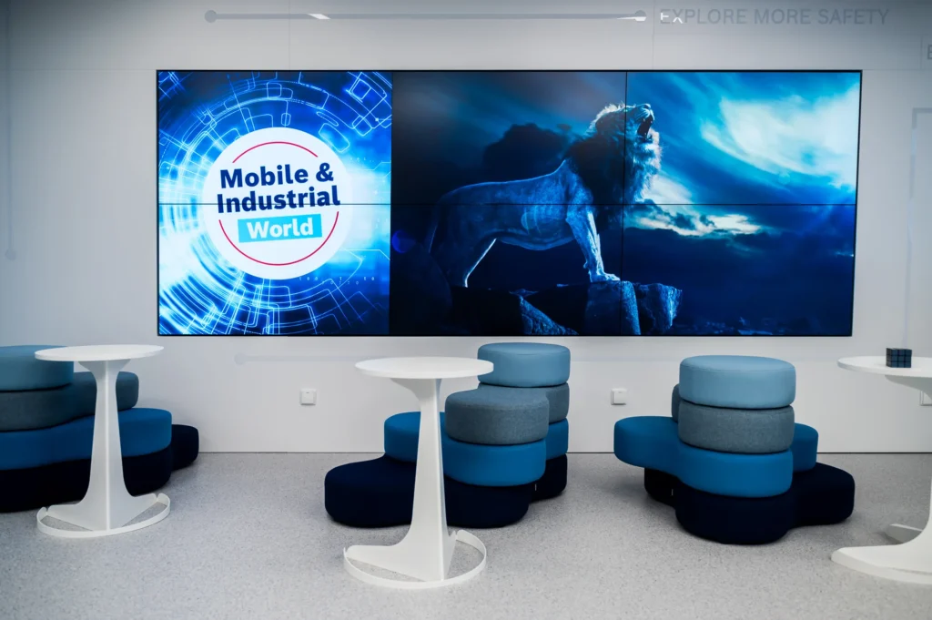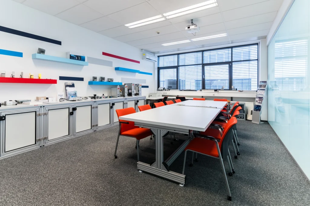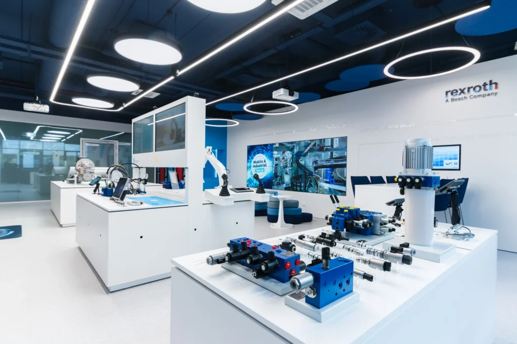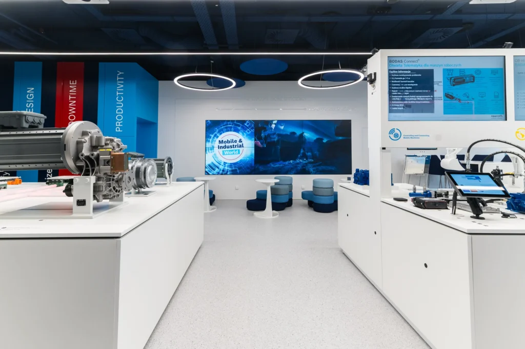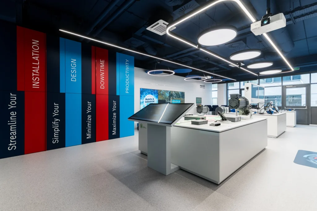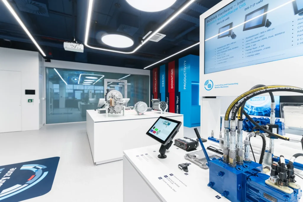 Nowoczesny showroom sfotografowany w minimalistycznym stylu, podkreślający technologię i design.