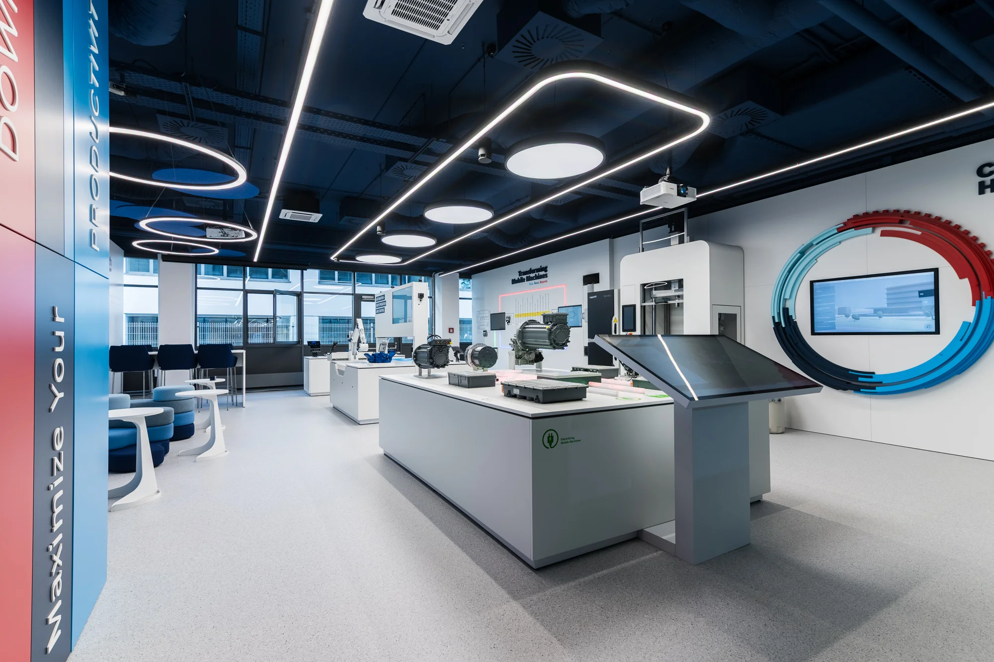 Nowoczesny showroom sfotografowany w minimalistycznym stylu, podkreślający technologię i design.