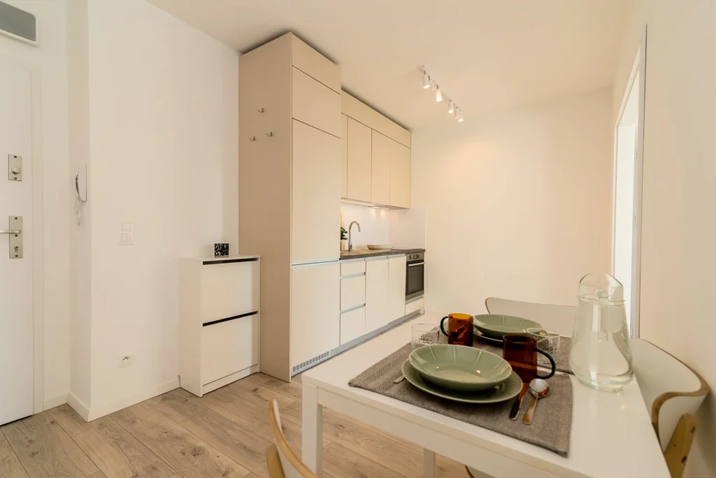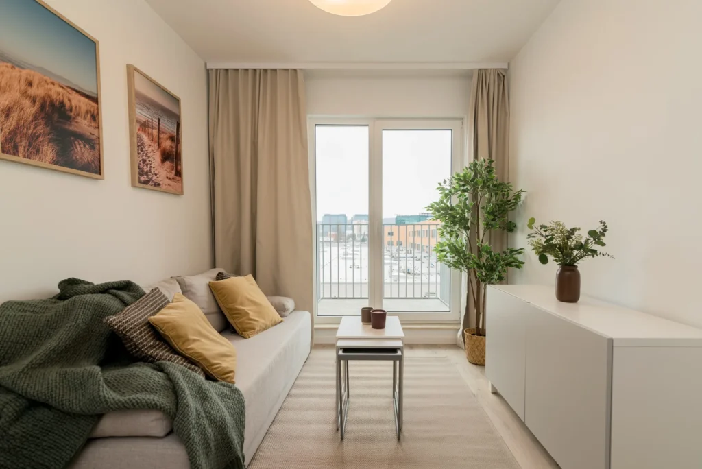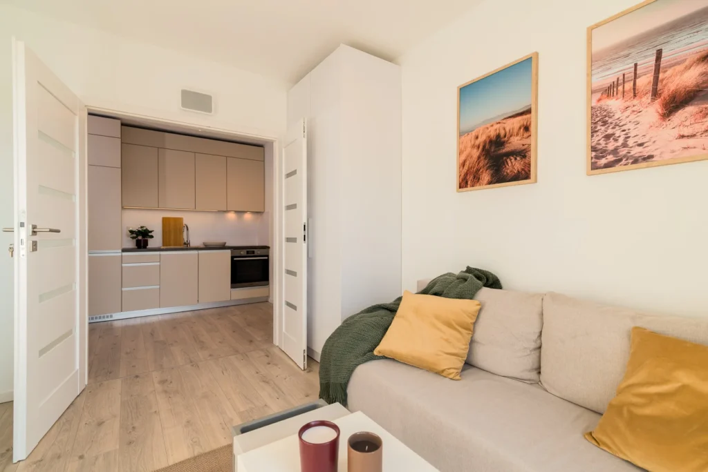 Nowoczesne mieszkanie dwupokojowe w Gdańsku – jasne wnętrza w eleganckiej aranżacji.